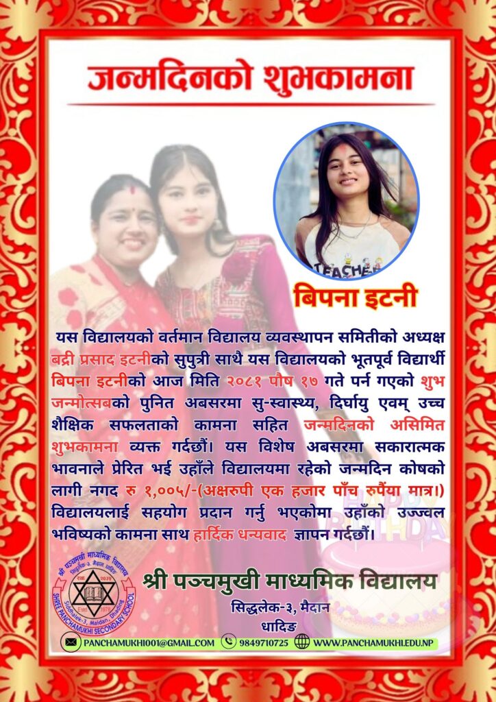 यस विद्यालयको वर्तमान विद्यालय व्यवस्थापन समितीको अध्यक्ष बद्री प्रसाद इटनीको सुपुत्री साथै यस विद्यालयको भूतपूर्व विद्यार्थी बिपना इटनीको मिति २०८१ पौष १७ गते पर्न गएको शुभ जन्मोत्सबको पुनित अबसरमा सु-स्वास्थ्य, दिर्घायु एवम् उच्च शैक्षिक सफलताको कामना सहित जन्मदिनको असिमित शुभकामना व्यक्त गर्दछौं। यस विशेष अबसरमा सकारात्मक भावनाले प्रेरित भई उहाँले विद्यालयमा रहेको जन्मदिन कोषको लागी […]