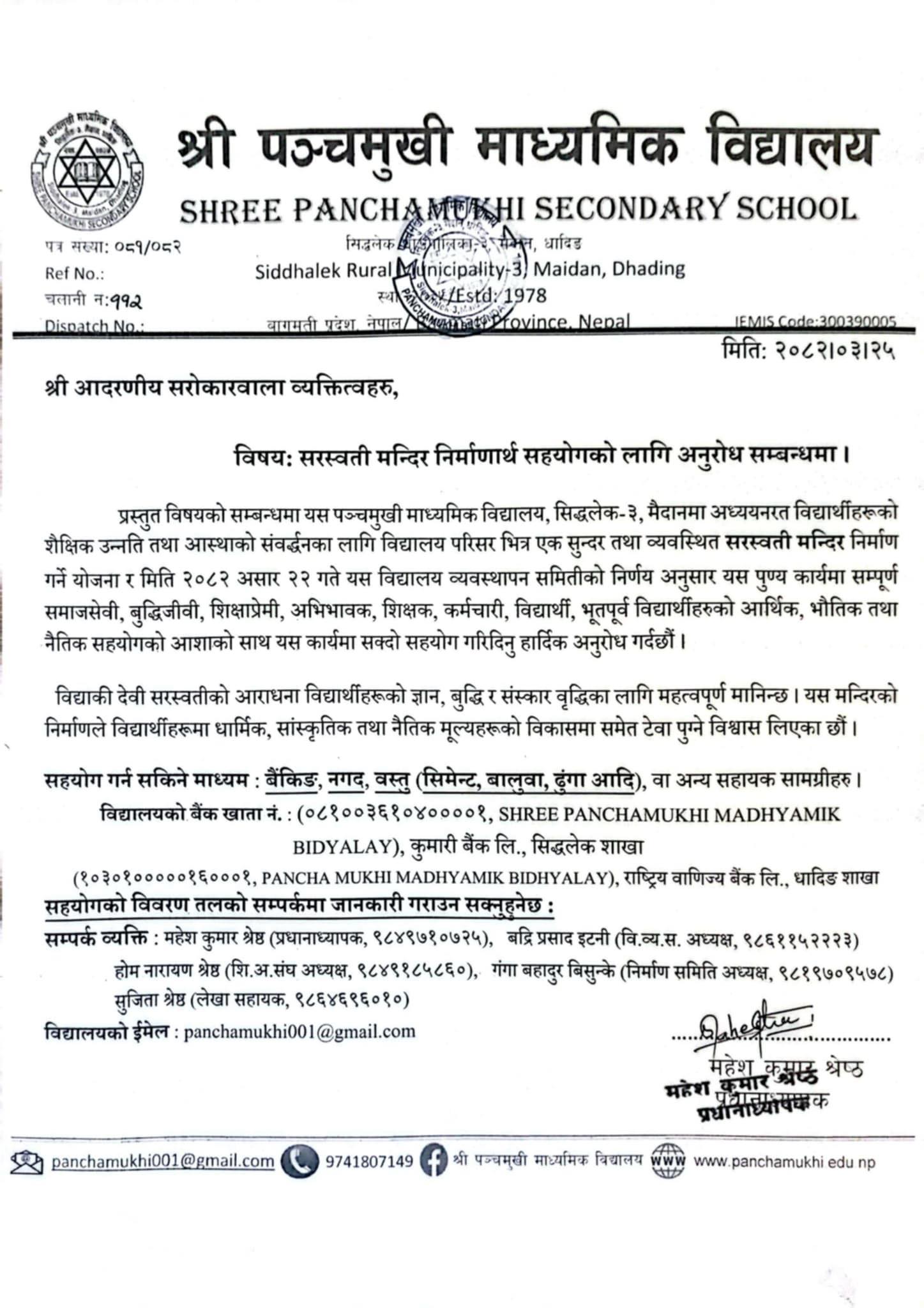 यस पञ्चमुखी माध्यमिक विद्यालय, सिद्धलेक–३, मैदानमा अध्ययनरत विद्यार्थीहरूको शैक्षिक उन्नति तथा आस्थाको संवर्द्धनका लागि विद्यालय परिसर भित्र एक सुन्दर तथा व्यवस्थित सरस्वती मन्दिर निर्माण गर्ने योजना र मिति २०८२ असार २२ गते यस विद्यालय व्यवस्थापन समितीको निर्णय अनुसार यस पुण्य कार्यमा सम्पूर्ण समाजसेवी, बुद्धिजीवी, शिक्षाप्रेमी, अभिभावक, शिक्षक, कर्मचारी, विद्यार्थी, भूतपूर्व विद्यार्थीहरुको आर्थिक, भौतिक तथा नैतिक सहयोगको आशाको साथ यस कार्यमा सक्दो सहयोग गरिदिनु हार्दिक अनुरोध गर्दछौं ।