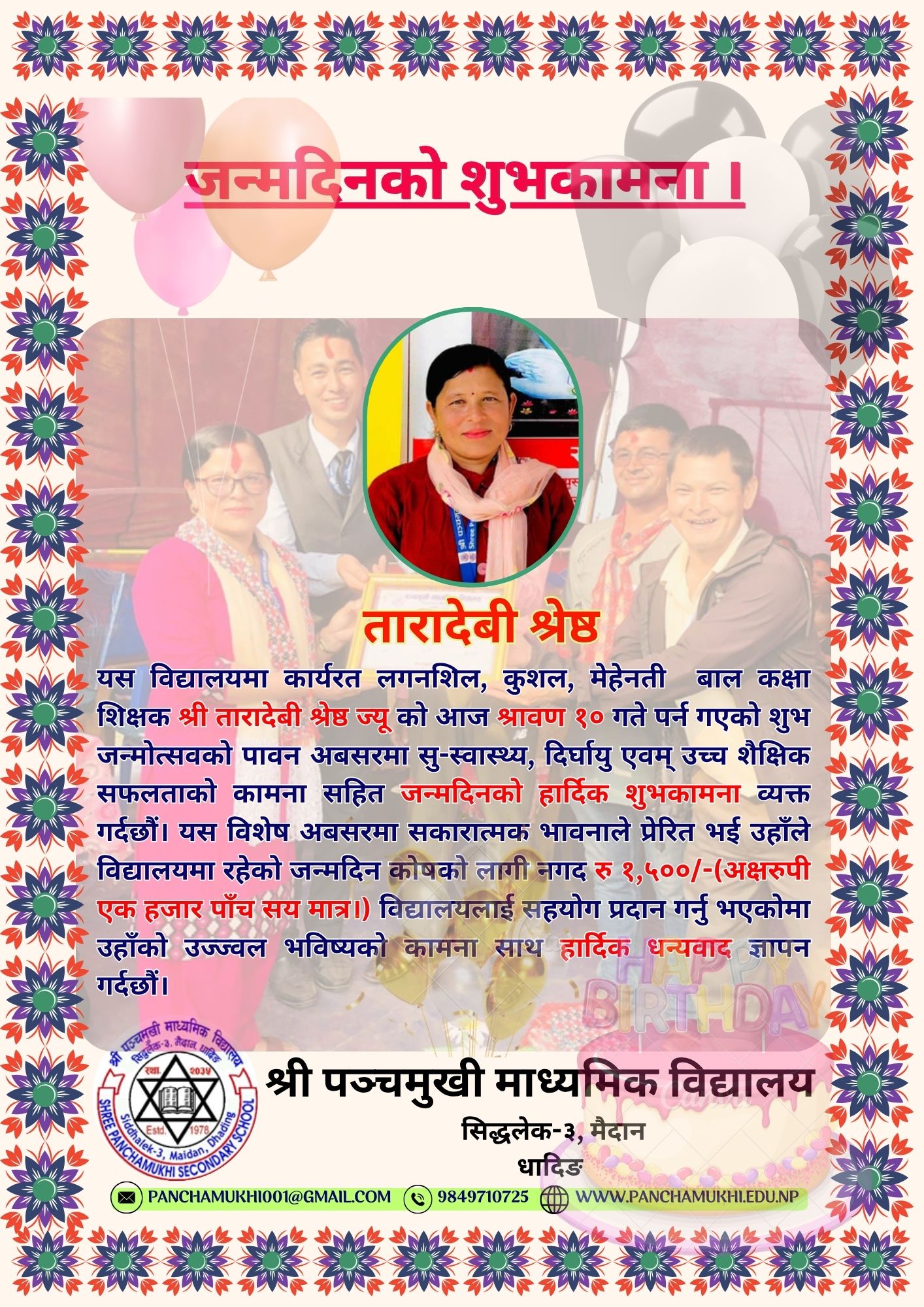 यस विद्यालयमा कार्यरत लगनशिल, कुशल, मेहेनती बाल कक्षा शिक्षक श्री तारादेबी श्रेष्ठ ज्यू को श्रावण १० गते पर्न गएको शुभ जन्मोत्सवको पावन अबसरमा सु-स्वास्थ्य, दिर्घायु एवम् उच्च शैक्षिक सफलताको कामना सहित जन्मदिनको हार्दिक शुभकामना व्यक्त गर्दछौं। यस विशेष अबसरमा सकारात्मक भावनाले प्रेरित भई उहाँले विद्यालयमा रहेको जन्मदिन कोषको लागी नगद रु १,५००/-(अक्षरुपी एक हजार पाँच सय मात्र।) विद्यालयलाई सहयोग प्रदान गर्नु भएकोमा उहाँको उज्ज्वल भविष्यको कामना साथ हार्दिक धन्यवाद ज्ञापन गर्दछौं।